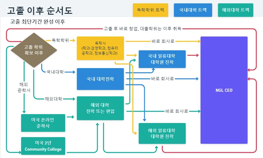 미국 일류 고등학교의 연간 학비와 미국 대학 2년간의 학비를 줄이면서도 유명한 미국대학으로 진학하는 방법은, 미국 대학 루트를 선택한 NGL에게 상세하게 제공되고, 대학을 졸업할 때까지 또는 대학원 입학때까지 우리 NGL이 훌륭한 CEO가 되도록, 필요한 서비스가 제공될 것입니다.