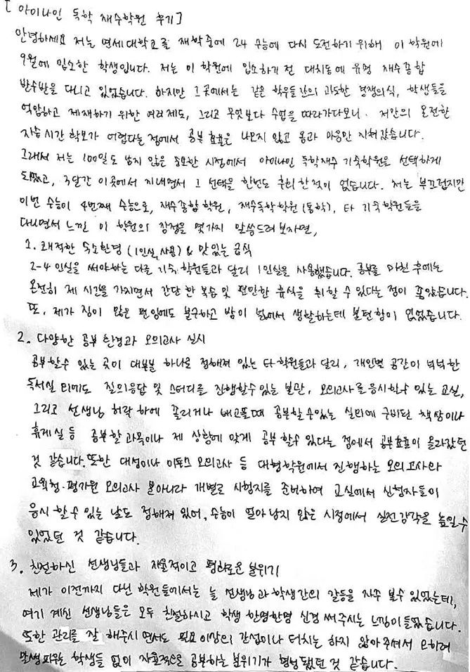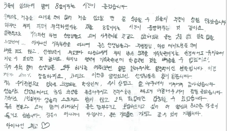 진지하고 정직한 마케팅을 하겠다고 약속한 본사는, 어떤 후기도 가공된 것이 없는, 학생들이 직접 작성한 것들만 게시합니다. 모든 후기는 상업적 목적으로 전문가가 쓴 다듬어진 글이 아닌, 학생들이 직접 작성한 솔직한 후기들입니다.