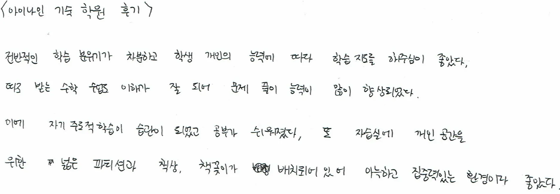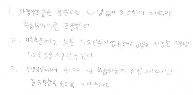 선생님들이 우리가 잘 학습하는지 신경 써 주시고, 잘 공부하도록 도와주신다. 저렴한 가격이며, 불필요한 시스템이 없이 학습 분위기를 조성해 주시는 점이 좋았다.