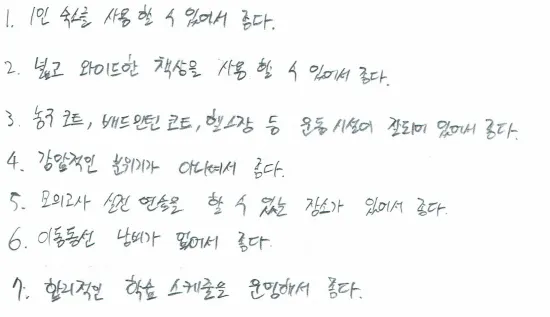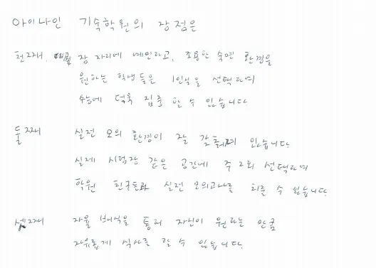 이동 소요시간이 적고, 넓은 부지, 넓은 개인학습공간, 아플 때 선생님 허락 받고 쉴 수 있어서 바로 컨디션 회복 가능한 것이 장점입니다.