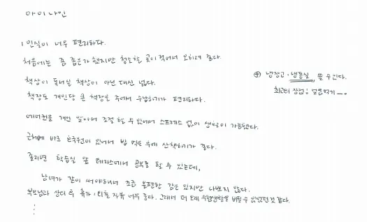 책상크고 벽이 있어 몰입도 높은 공부 가능. 종합기숙학원 다닐 때 2인실인데도 많이 싸웠는데 1인실이라 좋음. 산책할만한 넓은 공간이 많아서 좋음