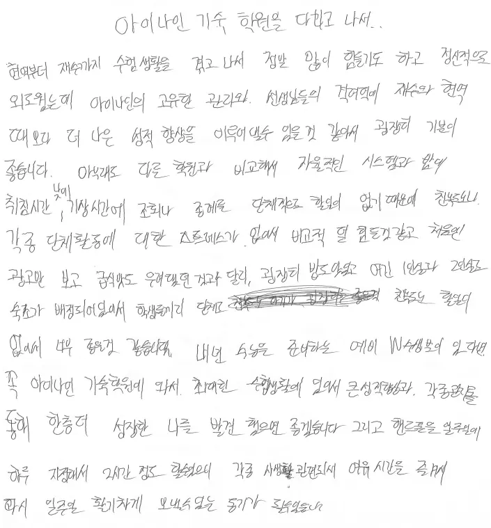 성적이 많이 좋게 나올 것 같아 기분이 좋음. 다른 곳과 비교해서 자율적인 시스템이 좋음. 광고 보고 밥이 맛이 없을 것을 걱정했는데 굉장히 밥이 맛있음. 일요일 오전에 핸드폰 사용을 허가해 주어서 다시 일주일을 활기차게 보낼 수 있는 동기가 되었음.