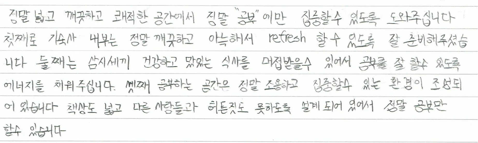 자연 풍경과 다양한 메뉴, 선생님들의 주기적인 학습실 확인으로 공부에 집중할 수 있었고, 학생들의 컴플레인을 바로 처리해 주어서 스트레스 받지 않고 좋은 환경에서 공부할 수 있었다.