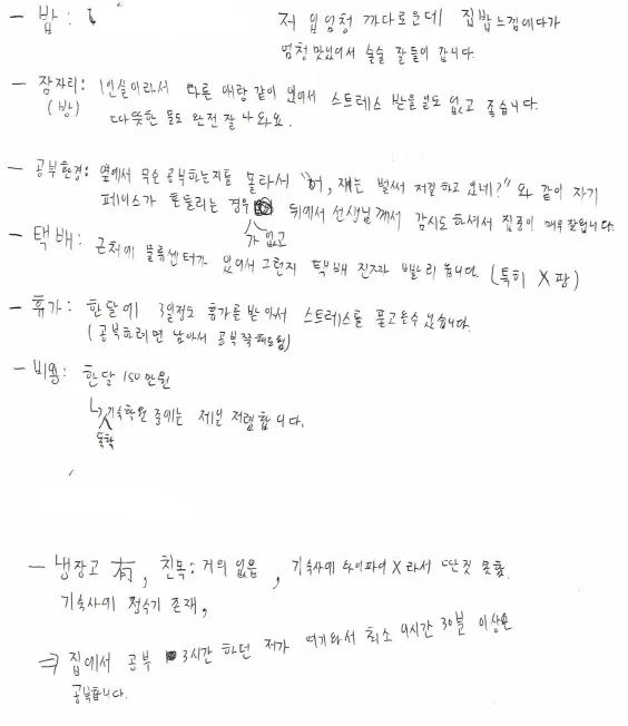 밖에서는 8-9시간 공부했다면 분위기 덕분에 12-13시간 공부했고, 철저한 전자기기 사용 관리와 정해진 시간 덕분에 몰입했음. 급식이 좋았고, 자유 배식으로 음식 조절 만족함. 피곤할 때 매점, 운동 공간, 산책로 등 기분 전환 요소가 충분했던 것 또한 만족