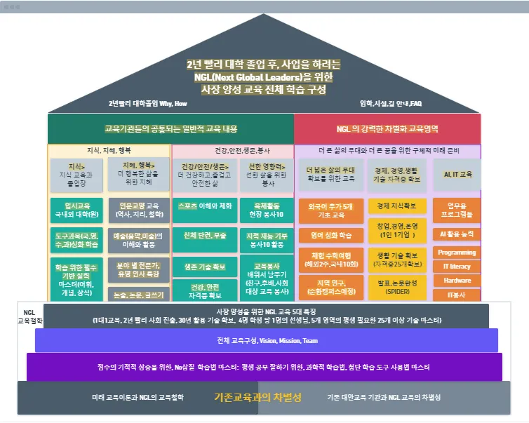 2년(최소) 더 빨리 사회에 진출하여 사업을 하려는 미래의 사업가들을 양성하는 NGL 학습센터의 모든 교육 내용을 도식화한 표입니다. 이 전체 학습 구성표를 기반으로 홈페이지가 만들어 졌으므로, 각 항목별 상세 내용은 홈페이지의 해당 항목에서 확인할 수 있습니다.