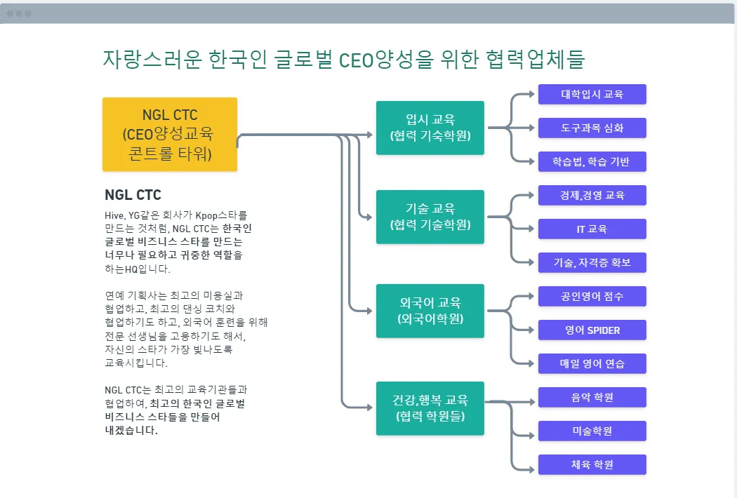 현재 유명 스타를 활용한 해외 교육 사업 진행중. 학생들의 해외진출 지원