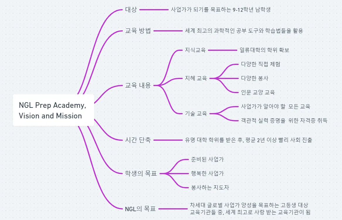 2년(최소) 더 빨리 사회에 진출하여 사업을 하려는 미래의 사업가들을 양성하는 NGL 학습센터의 모든 교육 내용을 도식화한 표입니다. 이 전체 학습 구성표를 기반으로 홈페이지가 만들어 졌으므로, 각 항목별 상세 내용은 홈페이지의 해당 항목에서 확인할 수 있습니다.