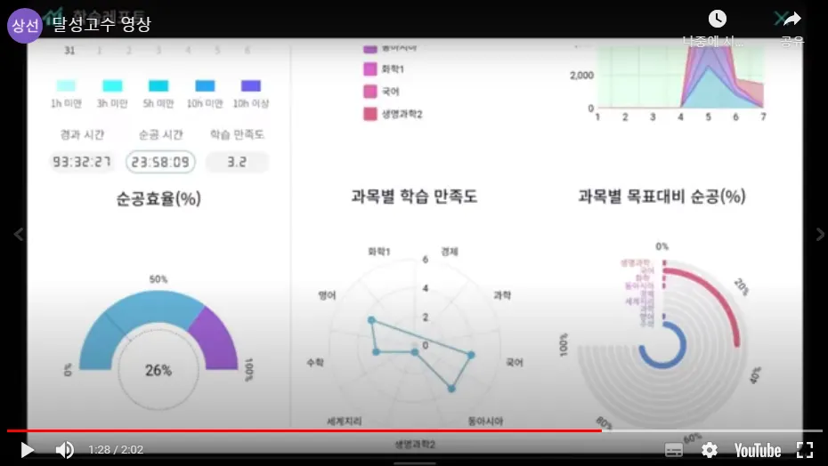 전체 공부시간 중, 진짜로 공부한 순수공부시간 비율, 과목별 순공 및 누적학습시간, 목표 달성율 등 표시>