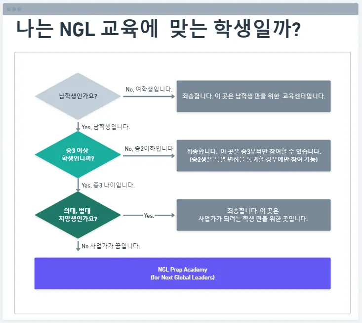 NGL은 공부를 마친 이후 사업가로서 사회에 봉사하는 지도자가 되기를 원하는 학생을 대상으로 한 교육기관입니다. 의대나 법대를 원하는 학생은 이 학교와 맞지 않습니다.